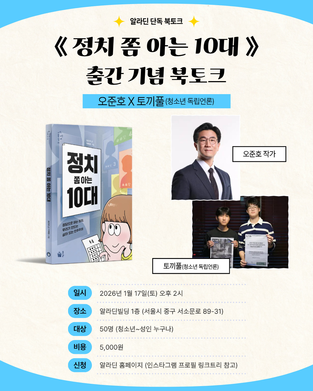 《정치 쫌 아는 10대》 출간 기념 오준호 x 토끼풀(청소년 독립언론) 북토크 - 참석 : 오준호, 청소년 독립언론 토끼풀 - 신청 : 알라딘(하단 링크를 통해 신청 가능) - 일시 : 2026년 1월 17일(토) 14시 - 장소: 알라딘빌딩 1층 (서울시 중구 서소문로 89-31) - 모집 인원: 50명 - 참가비 : 5,000원 인스타그램에서 보다 자세한 정보를 확인하세요.