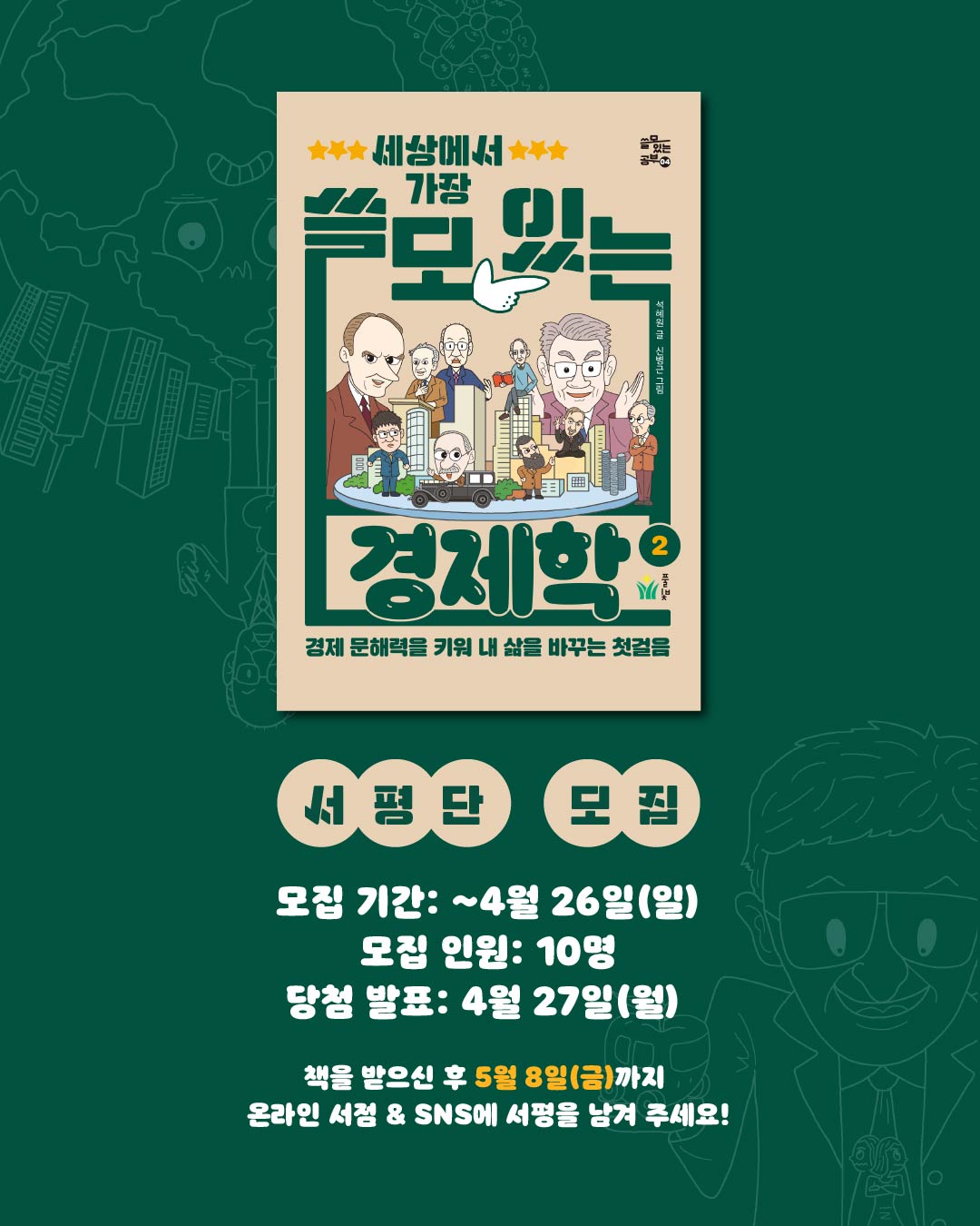 | 제목 | [서평단 모집]《세상에서 가장 쓸모 있는 경제학 2》인스타그램 서평단을 모집합니다. | ||||
